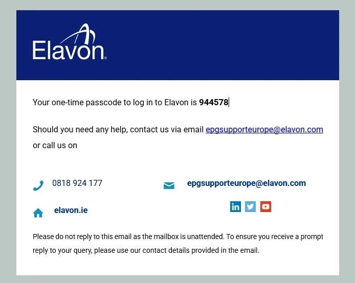 The email will come from noreply@elavon.com with the subject “Elavon Login Verification Code”.