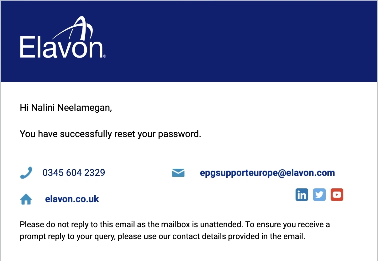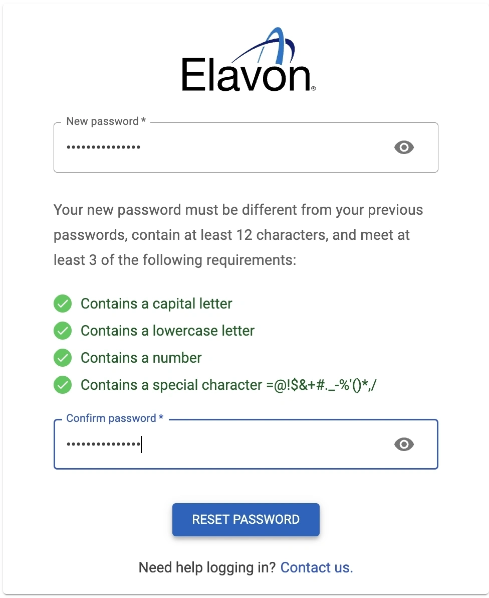 Select the ‘Reset Password’ button to be taken to a password reset screen where you can create a new password as per the secure password requirements: